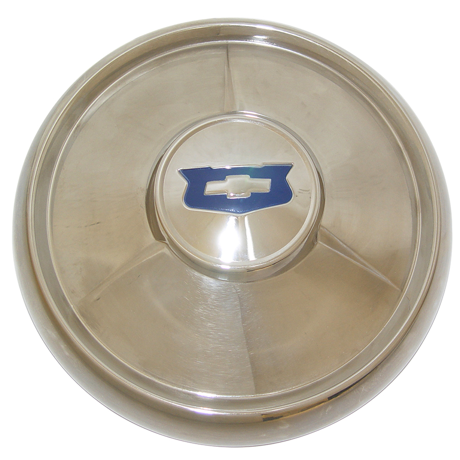54 Chevrolet Passenger Car Small Hub Cap, Chrome w/ Blue Painted Details, Each