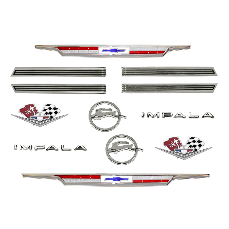 63 Chevrolet Impala V8 Emblem Kit. Note: Kit Includes Hood Emblem With Bezel, Trunk Emblem With Bezel V-flag Fender Emblems, 4 Piece Fender Louver Set, "Impala" 1/4 Letters