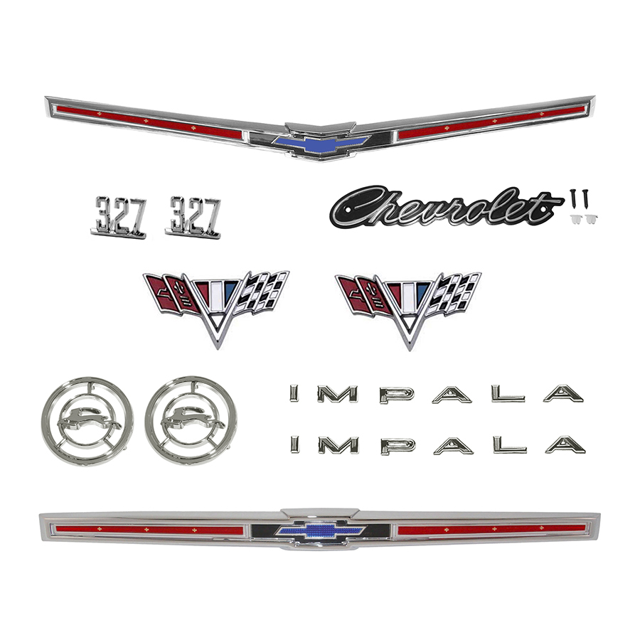 65 Chevrolet Impala V8 327 Emblem Kit. Note: Kit Includes Hood Emblem With Bezel, Trunk Emblem With Bezel, "Chevrolet" Grill Emblem, V-flag Fender Emblems, Engine Size Emblems, "Impala" Fender Letters & Round Fender Emblems.