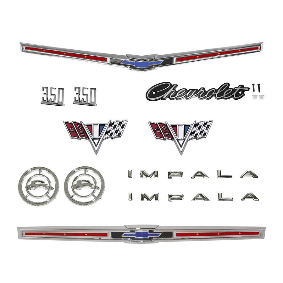 65 Chevrolet Impala V8 350 Emblem Kit. Note: Kit Includes Hood Emblem With Bezel, Trunk Emblem With Bezel, "Chevrolet" Grill Emblem, V-flag Fender Emblems, Engine Size Emblems, "Impala" Fender Letters & Round Fender Emblems.