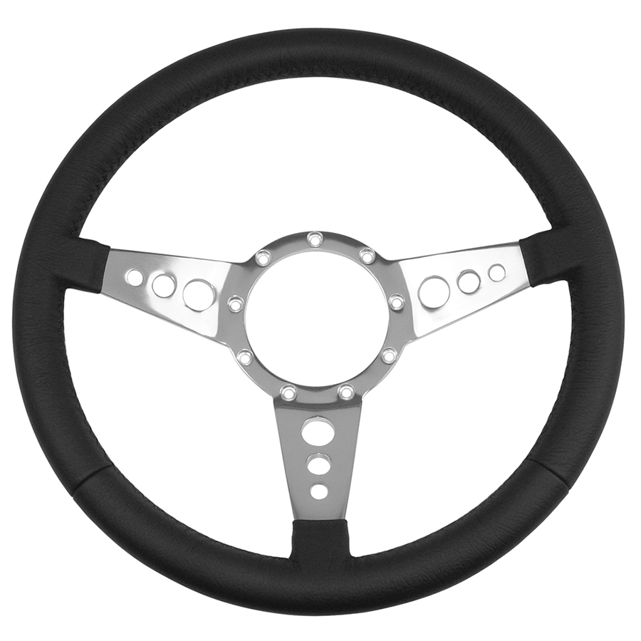 14" Volante Steering Wheel, Black Leather Wrap, 3 Spoke w/Holes. Made from machined aluminum and then polished. Each has a FULL WRAP of leather.