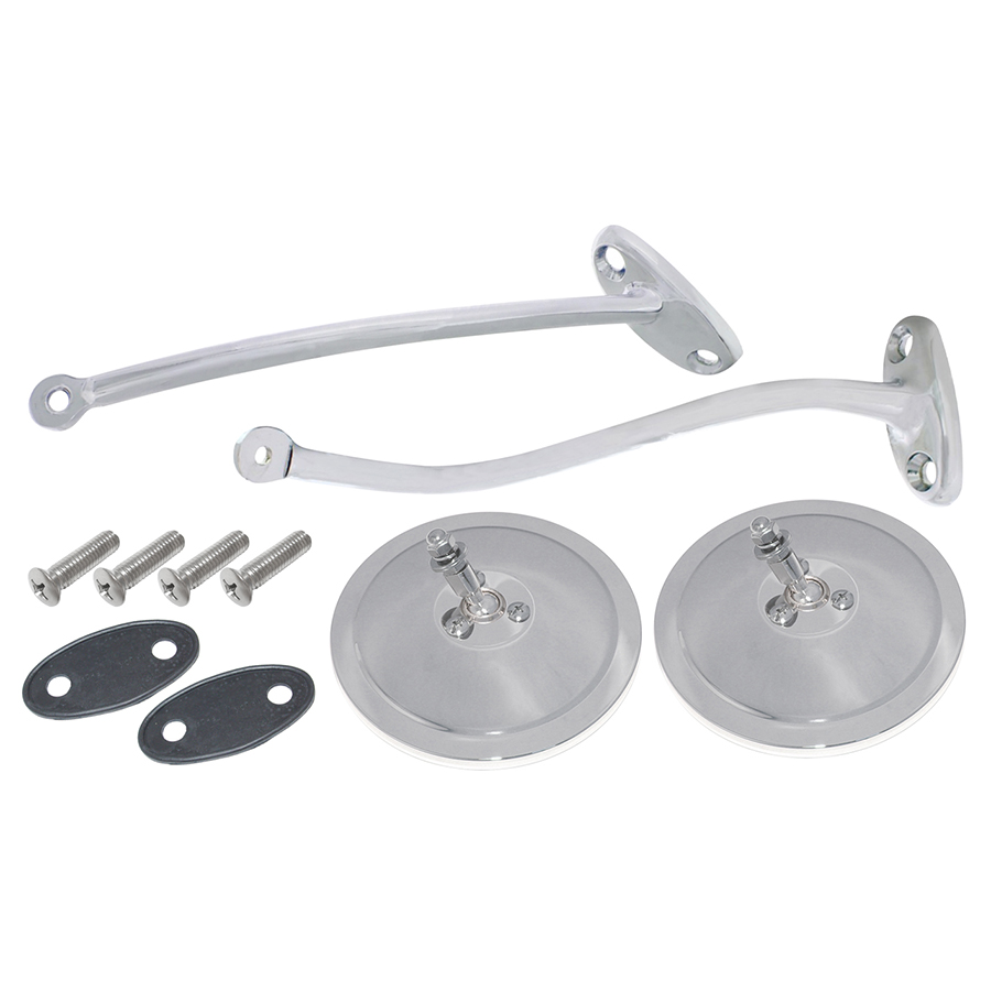 Includes: LH & RH Chrome Mirror Brackets, 2 Chrome Smooth Back 5" Round Mirrors, 4 Stainless Steel Mirror Bracket Screws & 2 Mirror Bracket Gaskets.