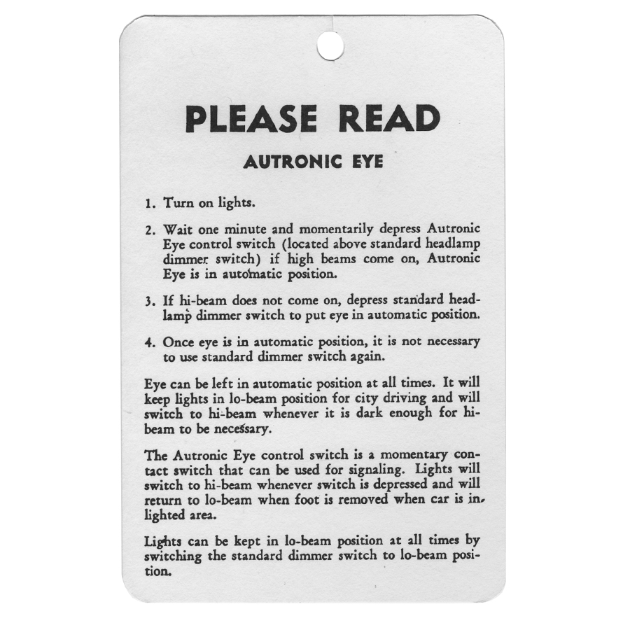 53-59 Chevrolet Full Size Car - Autronic Eye Instruction Tag