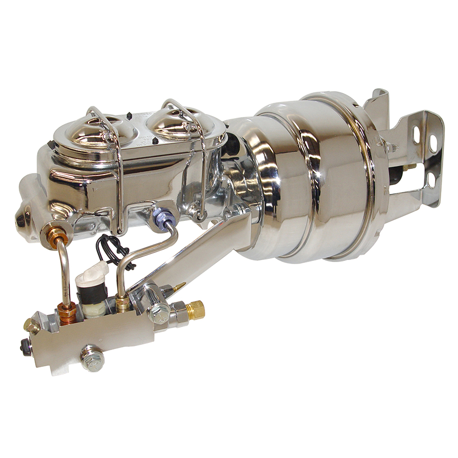 55-57 Chevrolet Car - Power Brake Booster / Master Cylinder / Proportioning Valve Kit. Dual Diaphragm, 8", Disc/Drum, Chrome Plated.