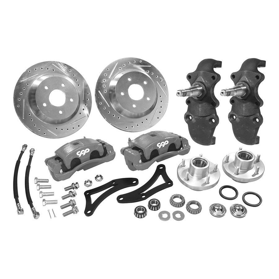 55-57 Chevrolet Full Size - 13" Dual Piston Front Disc Brake Conversion Kit, 2" Drop. Includes: 13" cross-drilled and gas-slotted rotors, dual 52mm piston calipers, 2" drop spindles, high performance brake pads, bearings, seals, steel hubs, rubber brake hoses, grease caps, spindle nuts, mounting brackets and all necessary hardware. MUST use 17" rims or larger.