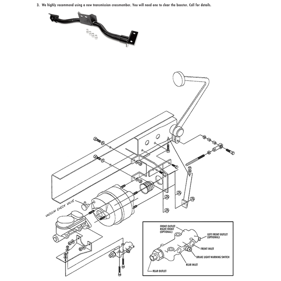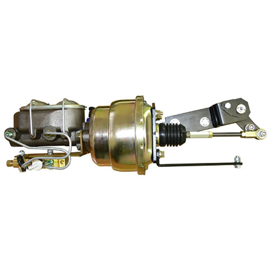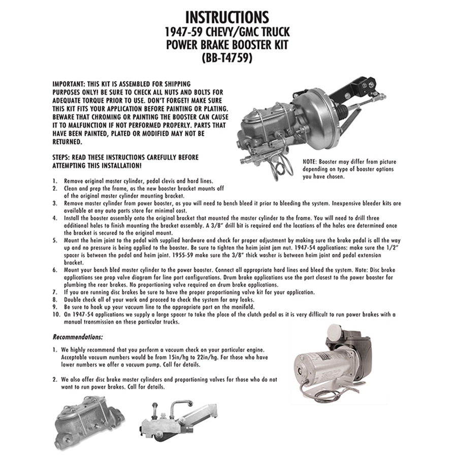 55-59 1/2 Ton Power Disc Brake Booster Kit. Stock Location Frame Mount. Complete with: booster, dual master cylinder, proportioning valve, mounting bracket with hardware.