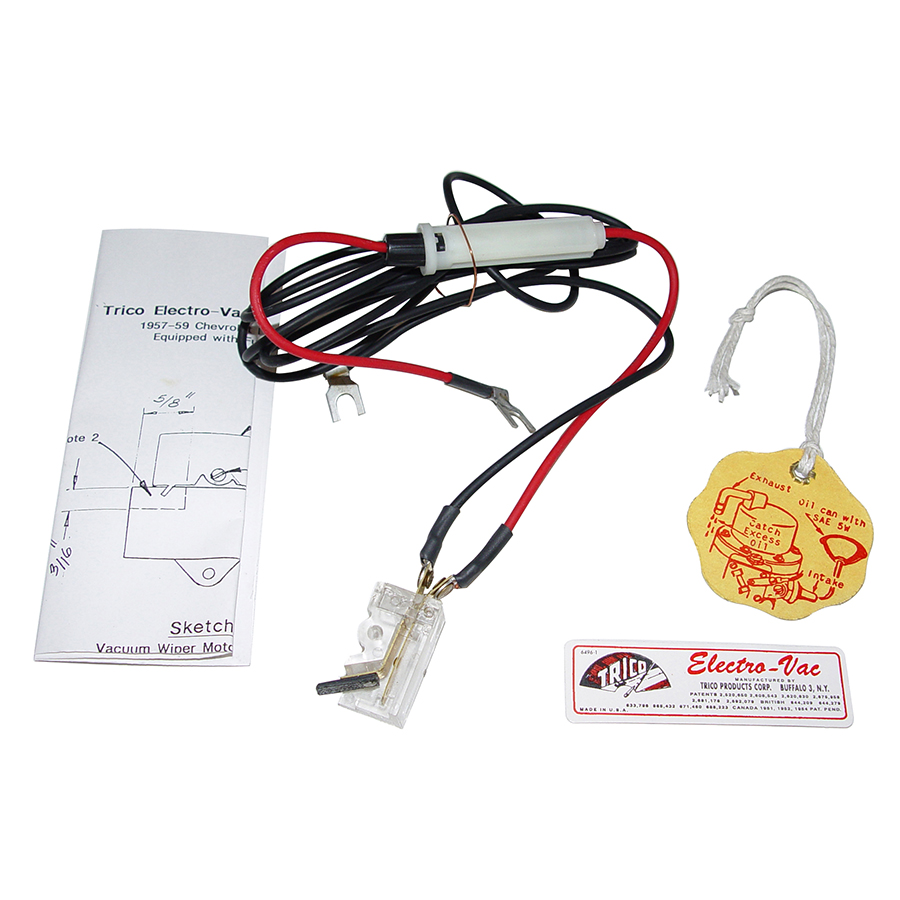 57 Chevrolet Passenger Car Fuel Injection Electro-Vac Switch, w/ Tag & Decal. Mounts on Wiper Motor, Controls Vacuum Boost Pump.