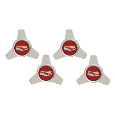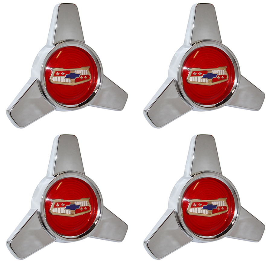 Spinner sets include 4 spinners with center emblems, 4 retainers with hardware. Red centers are original for 1957.