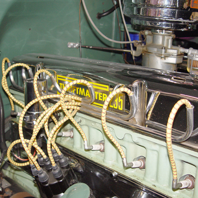 58-62 Chevrolet Passenger Car 6 Cyl. 235 Spark Plug Wire & Loom Kit Complete spark Plug wire & chrome wire loom set: Kit features pre-installed extended length yellow braided cloth covered plug wires.