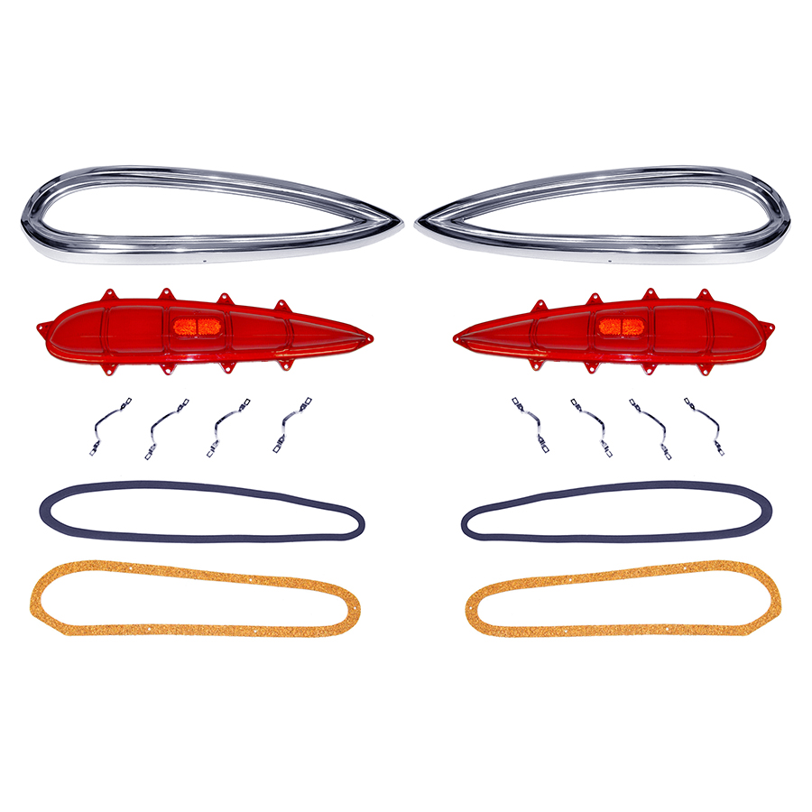 59 Impala Tail Light Lens, Lens Trim, And Gasket Set. Note: Kit Includes 2 Tail Light Bezels,2 Tail Light Lenses, 8 Piece Lens Trim Kit, & Lens Gaskets, & Housing To Body Gaskets.