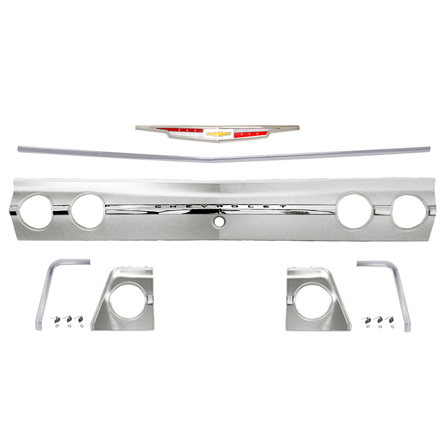 62 Chevrolet Impala Rear Panel Molding Kit. Note: Kit Includes 3 Piece Rear Deck Lid Panel Set With 7-piece Center Chrome Moldings Installed, LH & RH Rear Cove Moldings, Upper Trunk Molding & Complete Trunk Emblem. (SS Kit Includes "Impala SS" Emblem)