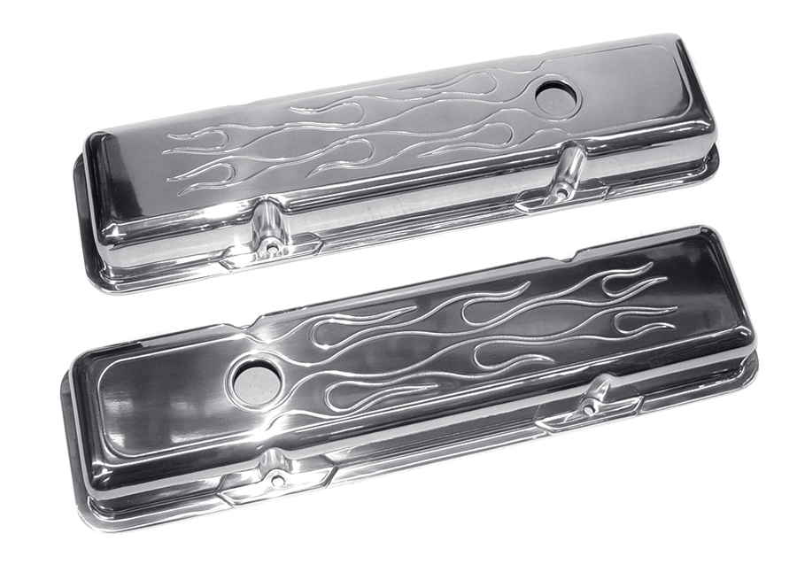 64-86 Chevelle / El Camino Small Block Polished Aluminum Valve Covers With Flames / Short