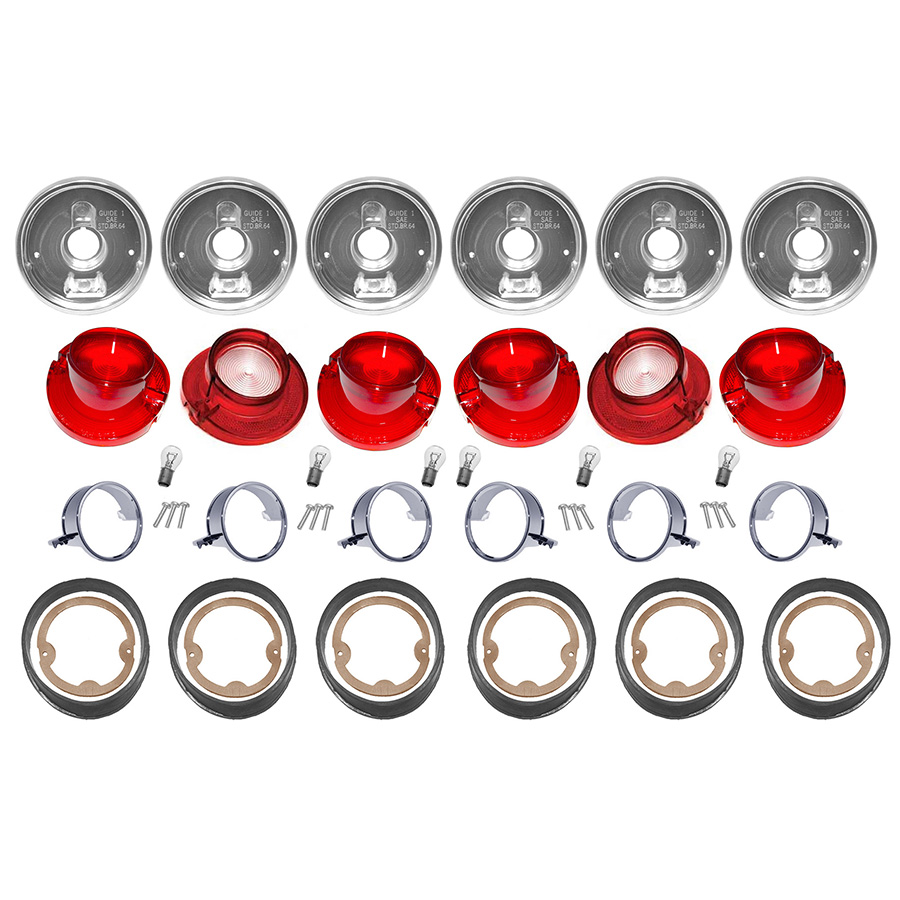 64 Chevrolet Impala Tail Light Kit w/ Housings Set of 6 Includes: Housings, lenses, lens gaskets, lens screws, lens trim rings, lens trim ring screws, Inner Housing to body seals, outer housing to body seals and bulbs.