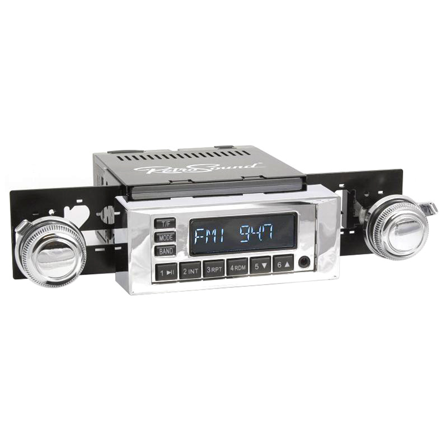 Retrosound's new Hermosa digital media receiver will mount in most classic vehicles using an ingenious InfiniMount bracket and shaft system that adjusts to fit any dash opening. The new Retrosound Hermosa looks like an old-fashioned radio, complete with authentic-look push button styling and replica knobs, but offers the modern conveniences of a rear mounted USB port, two auxiliary inputs, built-in high power amplifier and digital AM/FM tuner with RDS. You can connect your digital audio player, satellite radio, or a USB thumb drive loaded with music files and enjoy hours of entertainment in your classic vehicle.