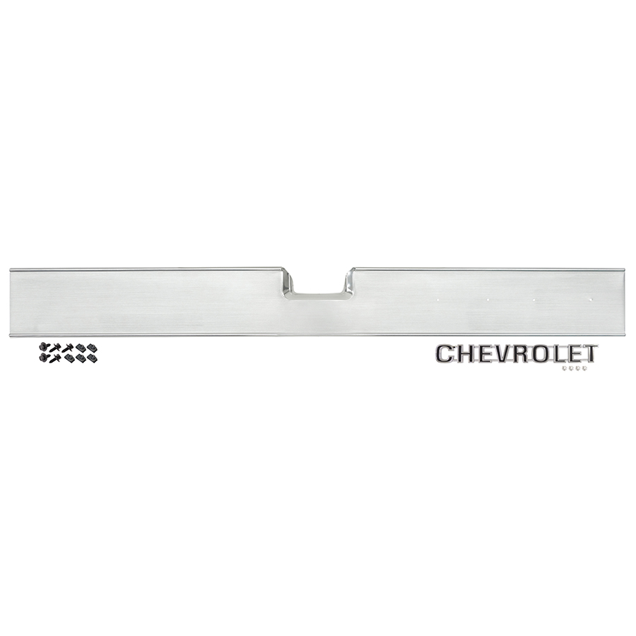73-80 Chevrolet Fleetside Truck Tailgate Band, Brushed Aluminum, with Chevrolet Emblem and Mounting Hardware.