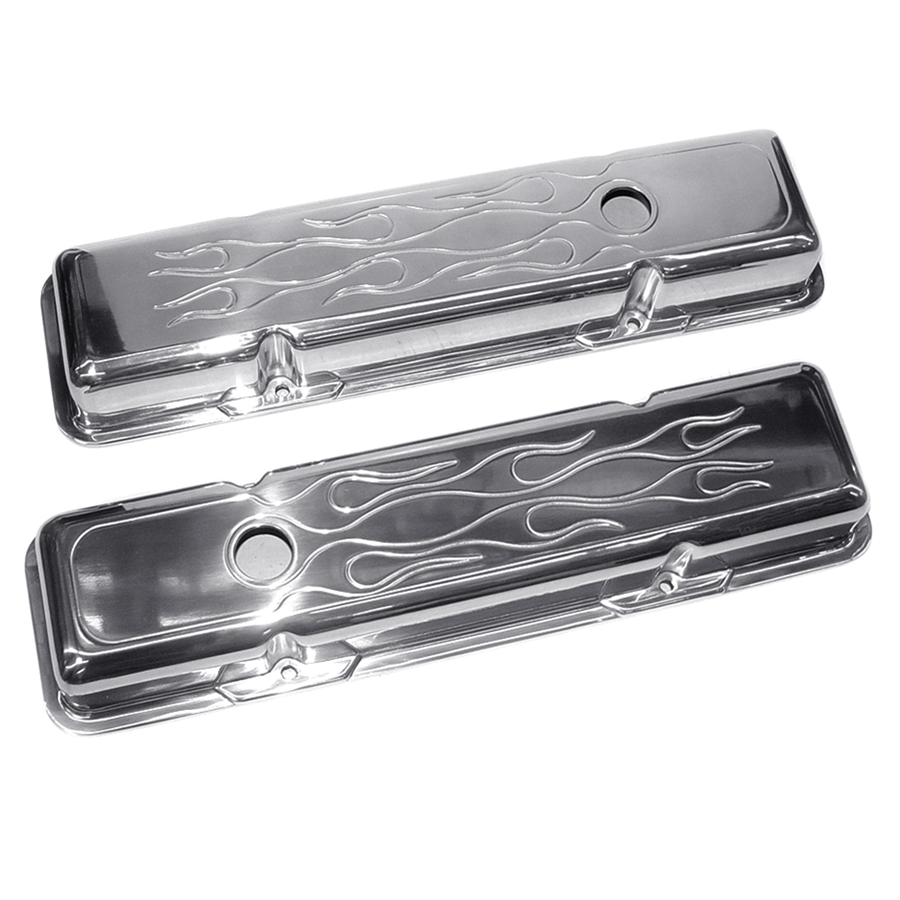 Chevrolet Small Block Car - Polished Aluminum Valve Covers with Flames, Short, Pair
