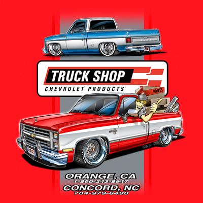 Men's T-Shirt Squarebody "Truck Shop" - Red, XX-Large Large Squarebody Cartoon Image on Back, Small Truck Shop Logo on LH Breast.