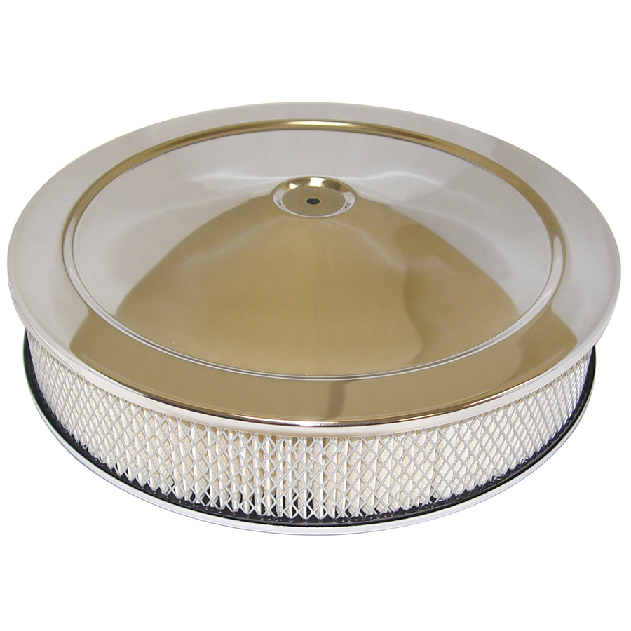 Open Element Air Cleaner, 4BBL Standard Base, Chrome. Replacement air cleaner with 3" paper filter. 14" diameter, 5-1/8" neck.